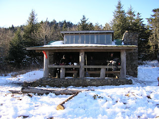 Anyway, my wife and I planned a three day trip on her Thanksgiving break. That year, a sudden early snow hit the high country along the Tennessee/North Carolina border. I looked at the weather forecast, and looked at recent temperatures, and we made the decision to go ahead and go anyway. "Snow camping! It'll be fun!" We packed accordingly and made our way up to the park, where we ran into 10-12 inches of snow covered trail that concealed an icy footpath underneath. The walk out to Icewater Springs was beautiful, but treacherous and exhausting. When we arrived at the shelter, we were quite surprised to find that there were more people there than permitted by reservation. Some people had even illegally set up tents on the north side of the ridge!